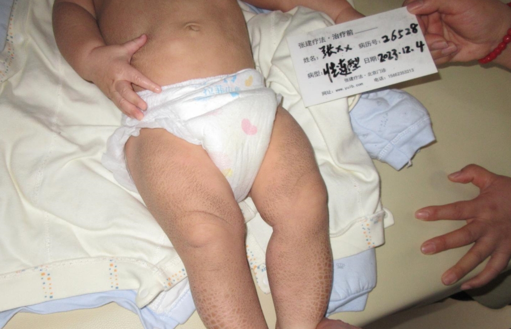 現(xiàn)病史:鱗屑全身都有,已經(jīng)形成斑紋斑點(diǎn),手腳正常,屬于性連型魚鱗皮膚。