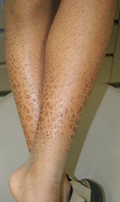 它是以片狀似魚鱗樣的粘著性鱗屑為特點(diǎn),多發(fā)于四肢伸側(cè),為對(duì)稱性淡褐色菱形或多角形鱗屑,并且以雙小腿前最明顯。