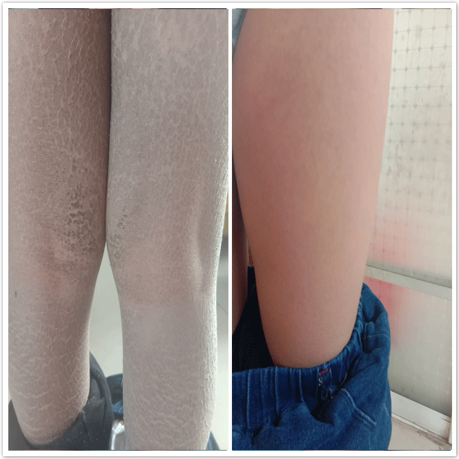 主訴:小腿部、面部、耳后、頸部、腹部、背部等都有魚鱗狀黑褐色鱗屑,通過清洗無法去除。