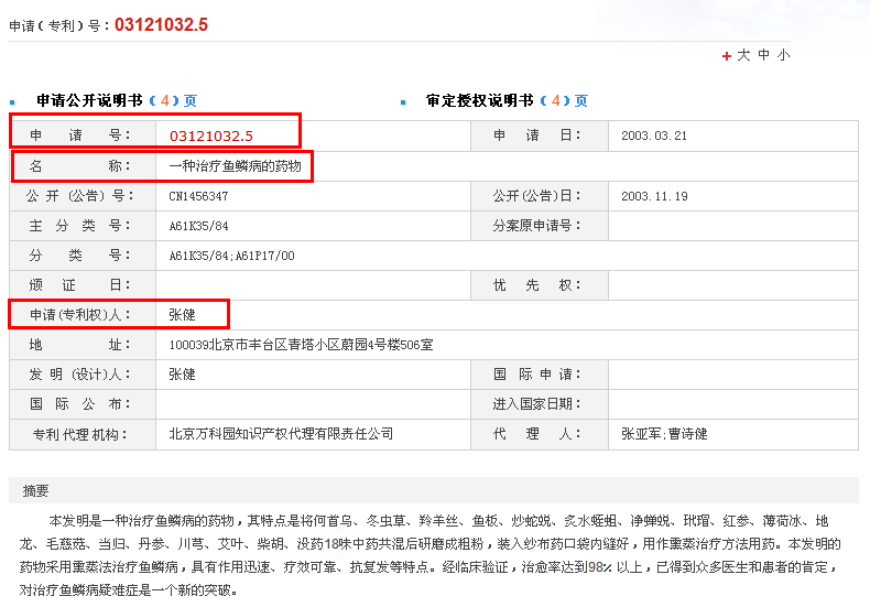 A、核對專利名稱及摘要,查看其具體的功效是否適用于魚鱗病。