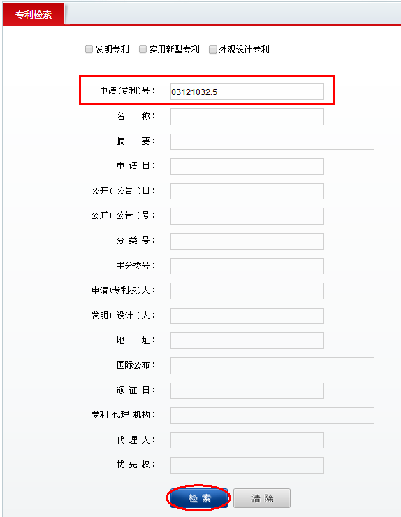 ?、冱c擊該鏈接:http://epub.sipo.gov.cn/gjcx.jsp 進入國家專利局官網檢索頁面。