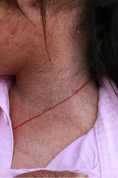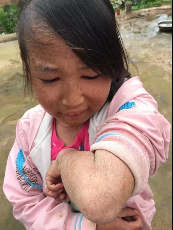 “我們不知道什么是魚鱗病,可不管是什么病,都得治呀”,就這樣,夫妻倆帶著小何先后跑遍了永仁縣人民醫(yī)院、四川省攀枝花市中心醫(yī)院、云南省楚雄彝族自治州人民醫(yī)院。可明明在醫(yī)院已經(jīng)治療的和正常人相同的小何,在回家后全身的皮膚都會再次被鱗屑覆蓋,無奈的付學(xué)芬只好四處探求民間偏方,努力的抵擋在病魔與女兒之間??蔁o數(shù)次恢復(fù)過后的復(fù)發(fā),無數(shù)日夜的掙扎,無數(shù)路程的奔波,將一家人消耗的精疲力竭,“實(shí)在是沒有錢了,我們真的沒辦法了”付學(xué)芬絕望的嘆了口氣。
