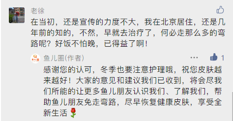 我們前前后后治療了3萬(wàn)多魚(yú)鱗病患者朋友,大家治完后反饋都不錯(cuò),有的治完已經(jīng)有11年了,鱗屑也沒(méi)有復(fù)發(fā)過(guò),皮膚比同齡人看著還好。