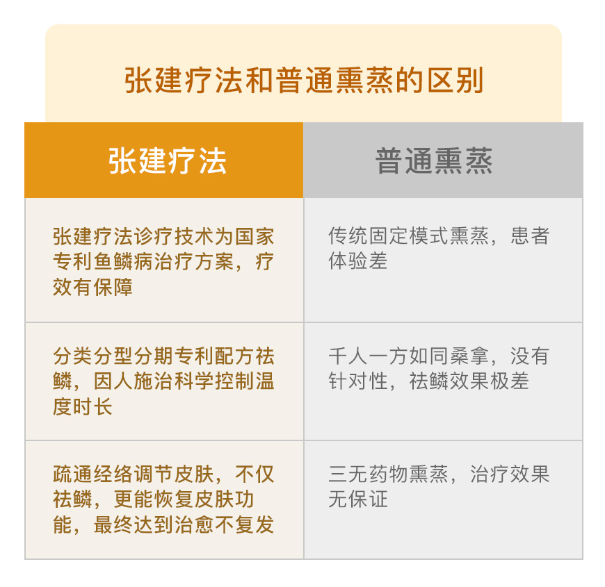 張建醫(yī)生較早地在國內(nèi)將中醫(yī)熏蒸手段與專利解毒去鱗中藥組方配伍應用,并針對魚鱗病患者皮膚情況,研制出護理保濕方法,形成“快速去鱗、平衡臟腑、改善膚質、激活免疫”的四位一體治療體系,既能快速去鱗屑又能抑制鱗屑再生,具有治療快、不反復、降遺傳的特點。張建療法也是目前治療魚鱗病比較安全有效的方法。